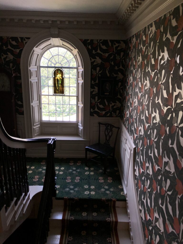 Alyssa Sweet: Yes, we’re walking up the stairs on this beautiful William Morrison carpet that is a reproduction, but it’s stunning. Green floral. Another example of that like outdoor feeling. It feels like you’re walking on a forest floor. And on the landing, we can look out at Sarah’s garden. Looks a lot different than it did back in the day. Sarah had a lot more trees than we have now and the post office wasn’t there. But overlooking this beautiful arched window is that stained glass work that Sarah Wyman Whitman did.