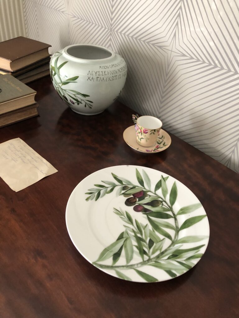 Kendra Gaylord: In this room, I think we may have found Sarah’s style. A slightly brooding room that feels like the colors of Maine were let in. It’s filled with all the things she loved and what she found useful. Next to her bed, attached to the door frame, is a pen in a small little cup that she could grab in bed. Next to her mirror, above her dresser, are many dangling pairs of eyeglasses. There is a portrait of her father on her bedside, and above it in the corner is a mirror. The room has two mirrors and no matter where you are, you can see the center of the mantle. The mantle is filled with books, a chalice, paintings, and silhouettes. But right in the center is a portrait of Annie. So no matter where Sarah was in the room, she could still see her. In this room, Sarah feels very alive. And you feel like you might be trespassing.
